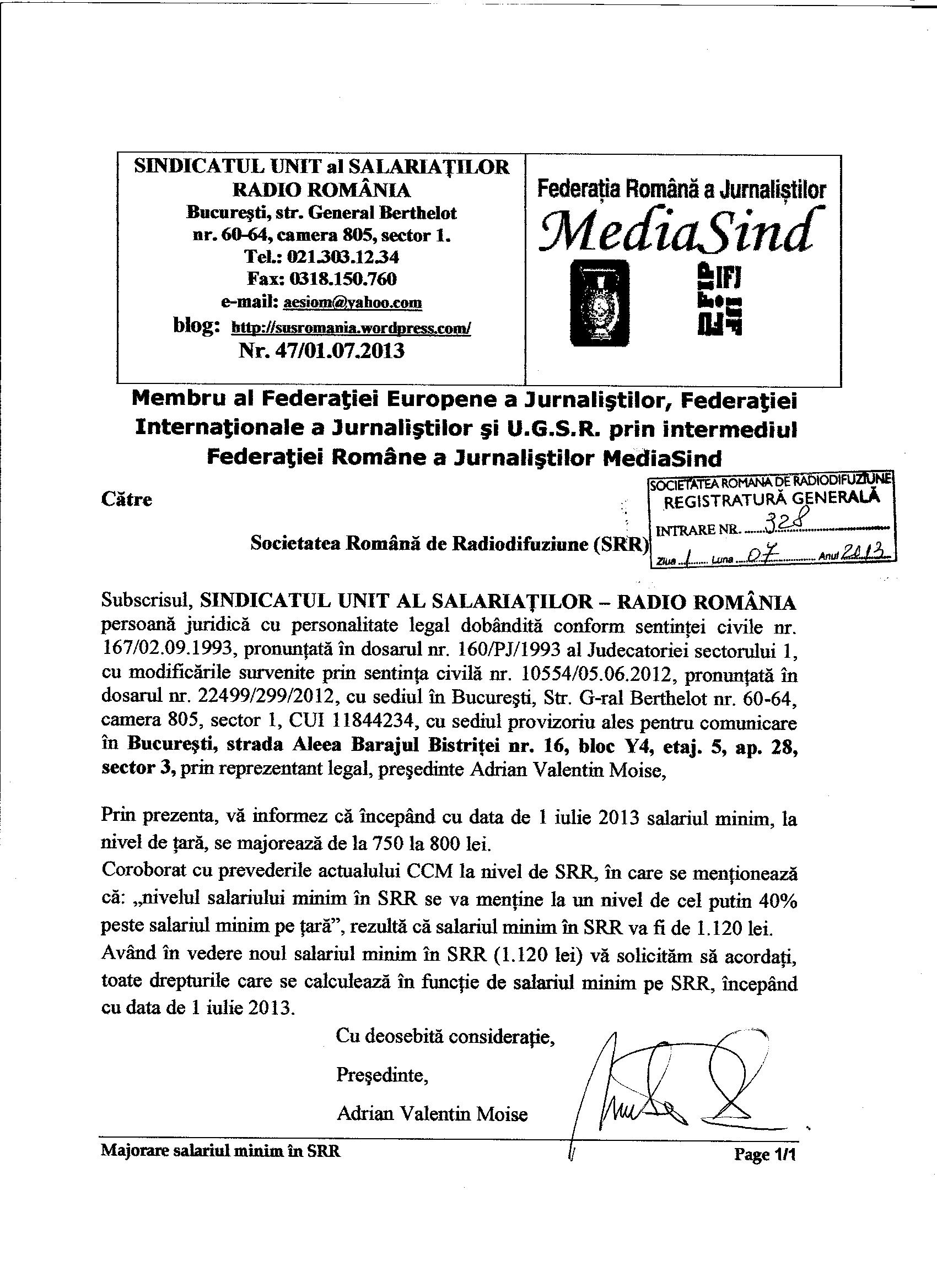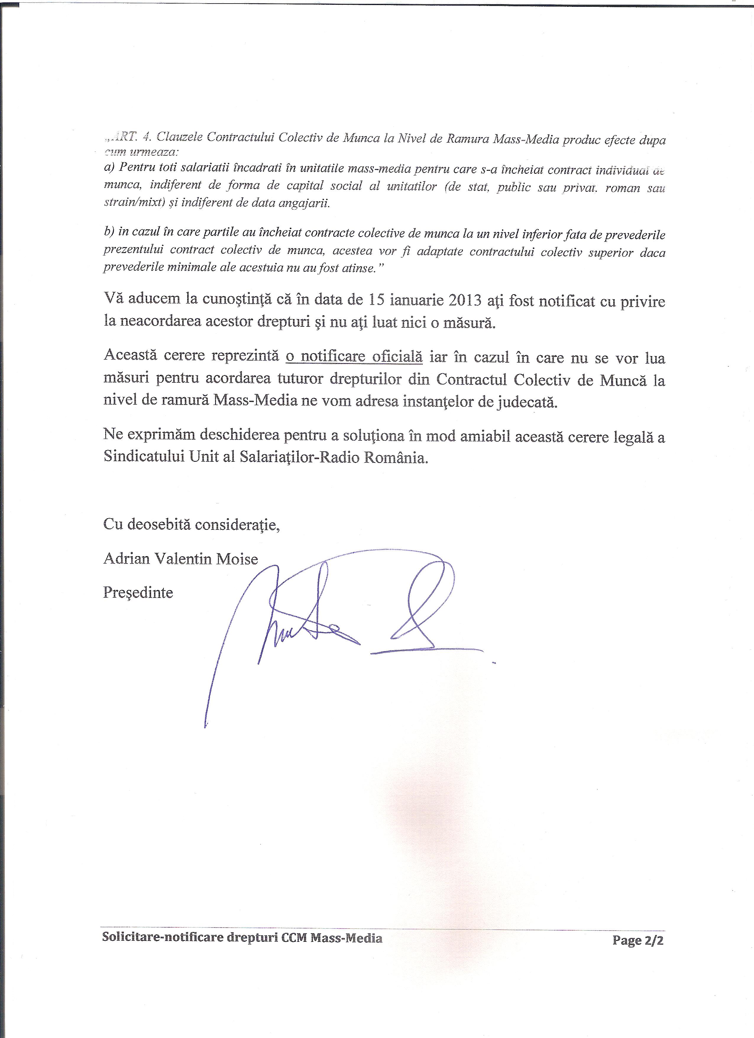 Cu toate presiunile din partea Conducerii SRR și a unor asa zisi lideri de sindicat, vom face toate demersurile, conform mandatului dumneavoastră, pentru acordarea membrilor SUS-Radio România a tuturor drepturilor din CCM la nivel de Mass Media.