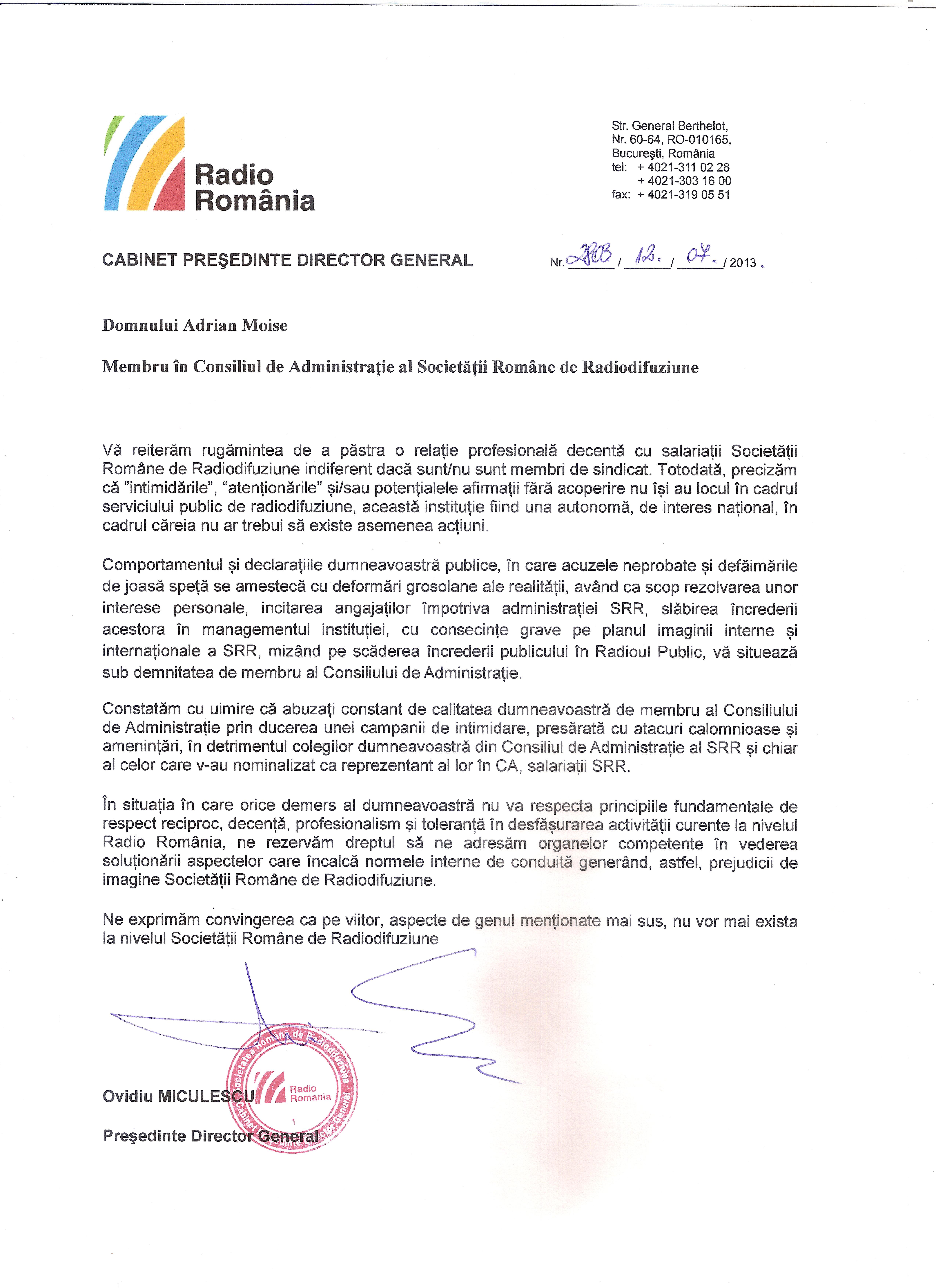 Zilele trecute am primit acasă o scrisoare oficială din partea SRR, semnată de președintele-director general Ovidiu Miculescu.
