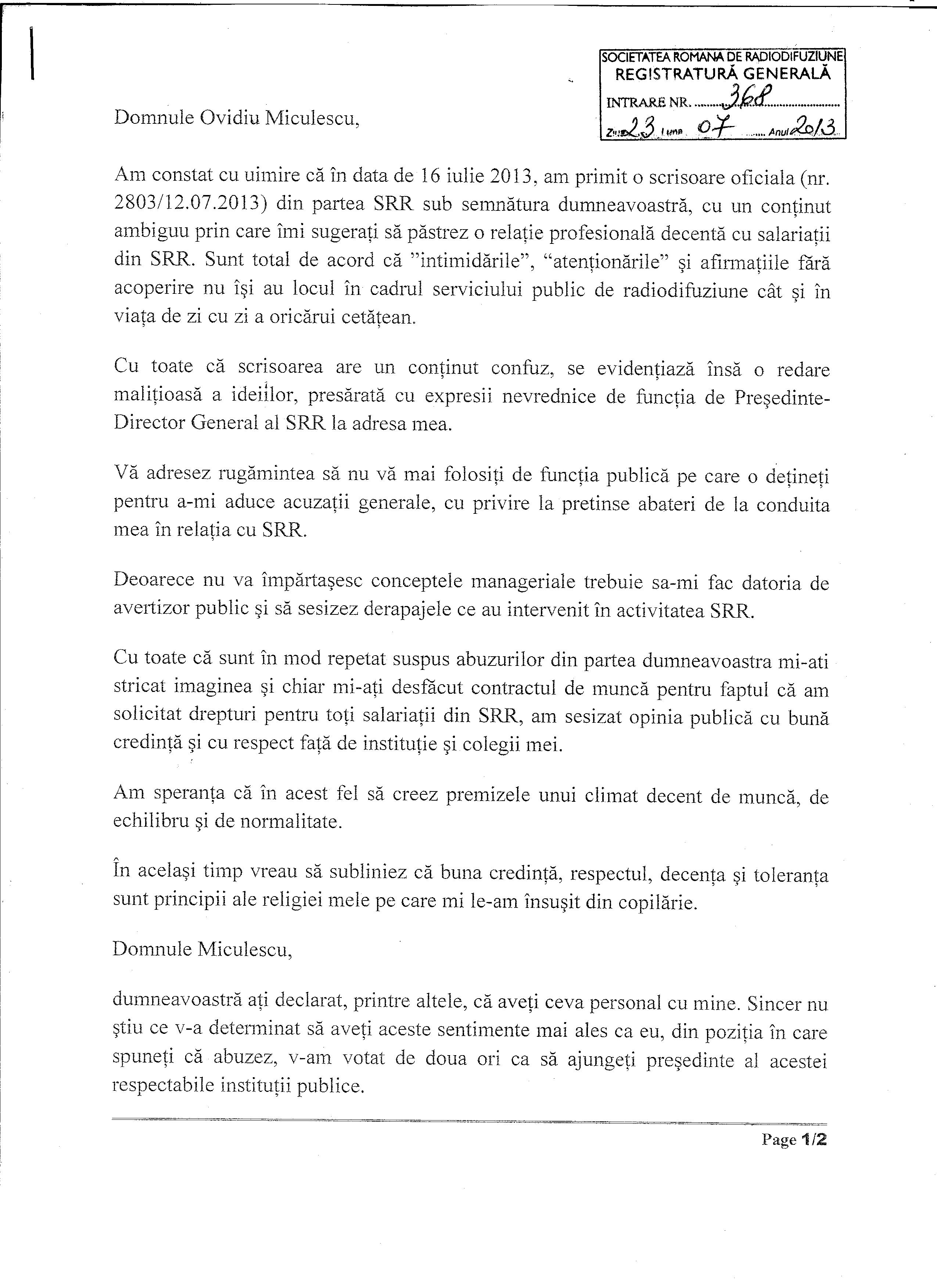 Astazi 24 iulie 2013, în jurul orei 15.15, în deschiderea ședinței de CA, Presedintele Ovidiu Miculescu a continuat prin a mă hărțui cu atacuri directe și incisive, cu scopul nedisimulat de a-mi provoca panică, creand un cadru intimidant, ostil, degradant și ofensiv.