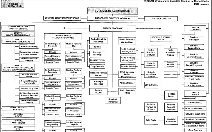 Nota: Autorul scrisorii deschise a avut rugamintea sa nu-i publicam numele pentru ca va fi dat afara. In imagine aveti noua organigrama a SRR, una extrem de stufofoasa, asa cum o vede noua conducerea a radioului public.