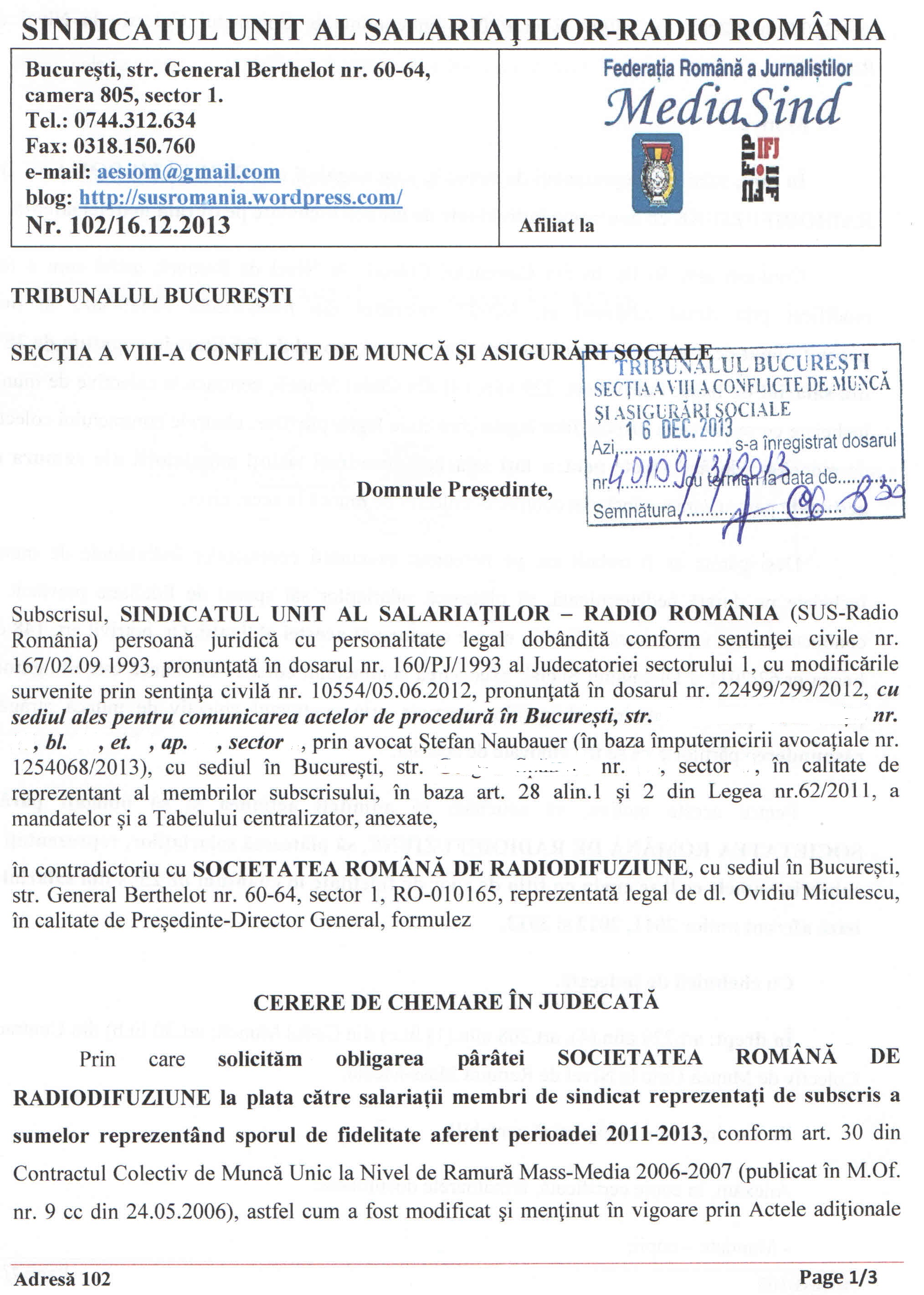 Sindicatul a depus deja acțiunea în instanță pe data de 16 decembrie 2013, vezi aici!