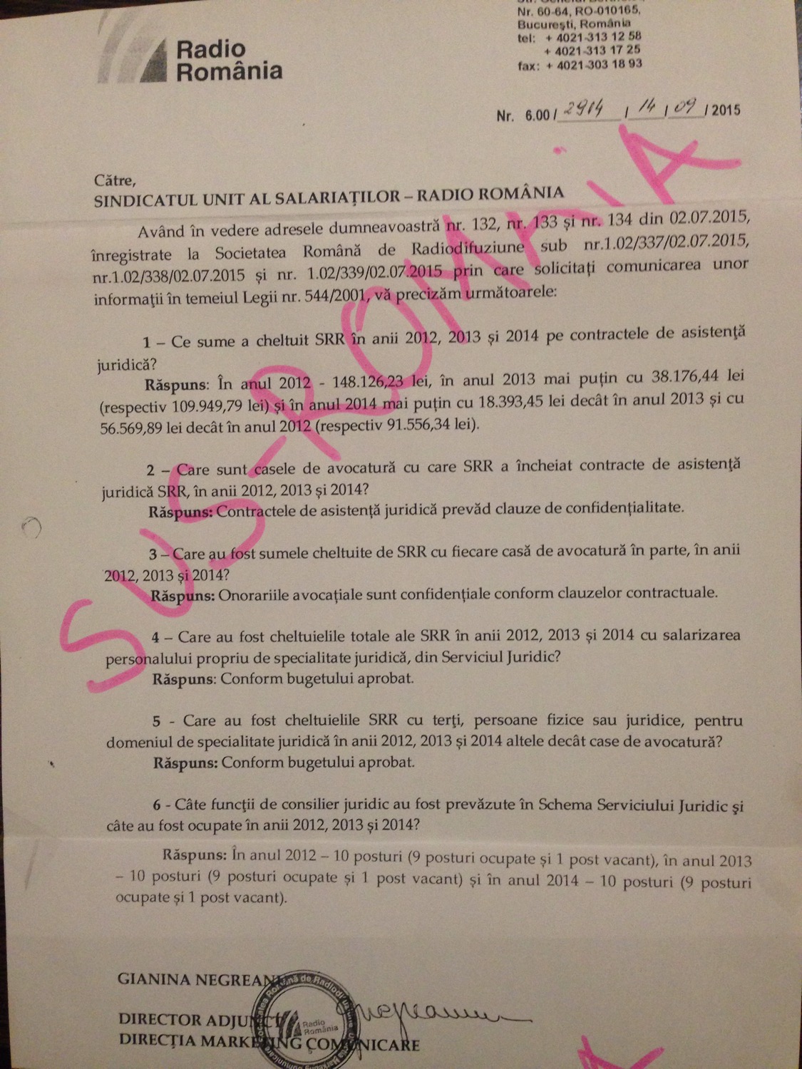 Tocmai a semnat CA al SRR o noua HCA ca sa achizitioneze alte servicii de avocatura. Pe bune, de ce mai e platita o armata de juriste? De ce sefa serviciului juridic are cel mai mare salariu de sef de serviciu din radio pt doar 9 subalterne, de ca are suv cu sofer si de ce mai are si cumul de functii? Pe asta ati citit-o? http://www.cdep.ro/interpel/2015/i8274A.pdf