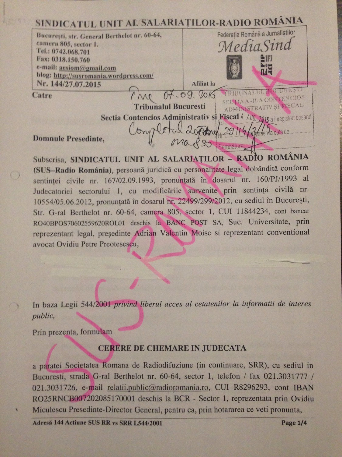 Vă prezentăm în continuare, care a fost cererea depusa de catre SUS-Radio Romania la SRR, privind furnizarea unor informatii de interes public, în temeiul Legii nr. 544/2001.