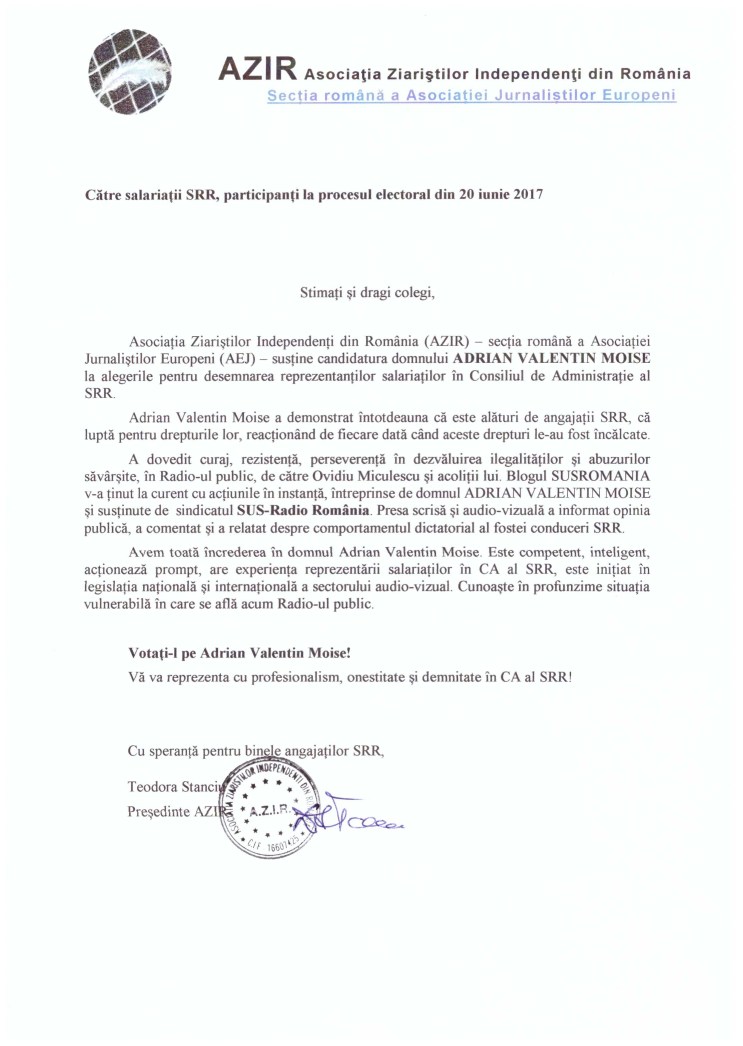Vă prezentăm scrisoarea din partea Asociației Ziariștilor Independenți din România (AZIR) – secția română a Asociației Jurnaliștilor Europeni (AEJ), cu sediul la Bruxelles