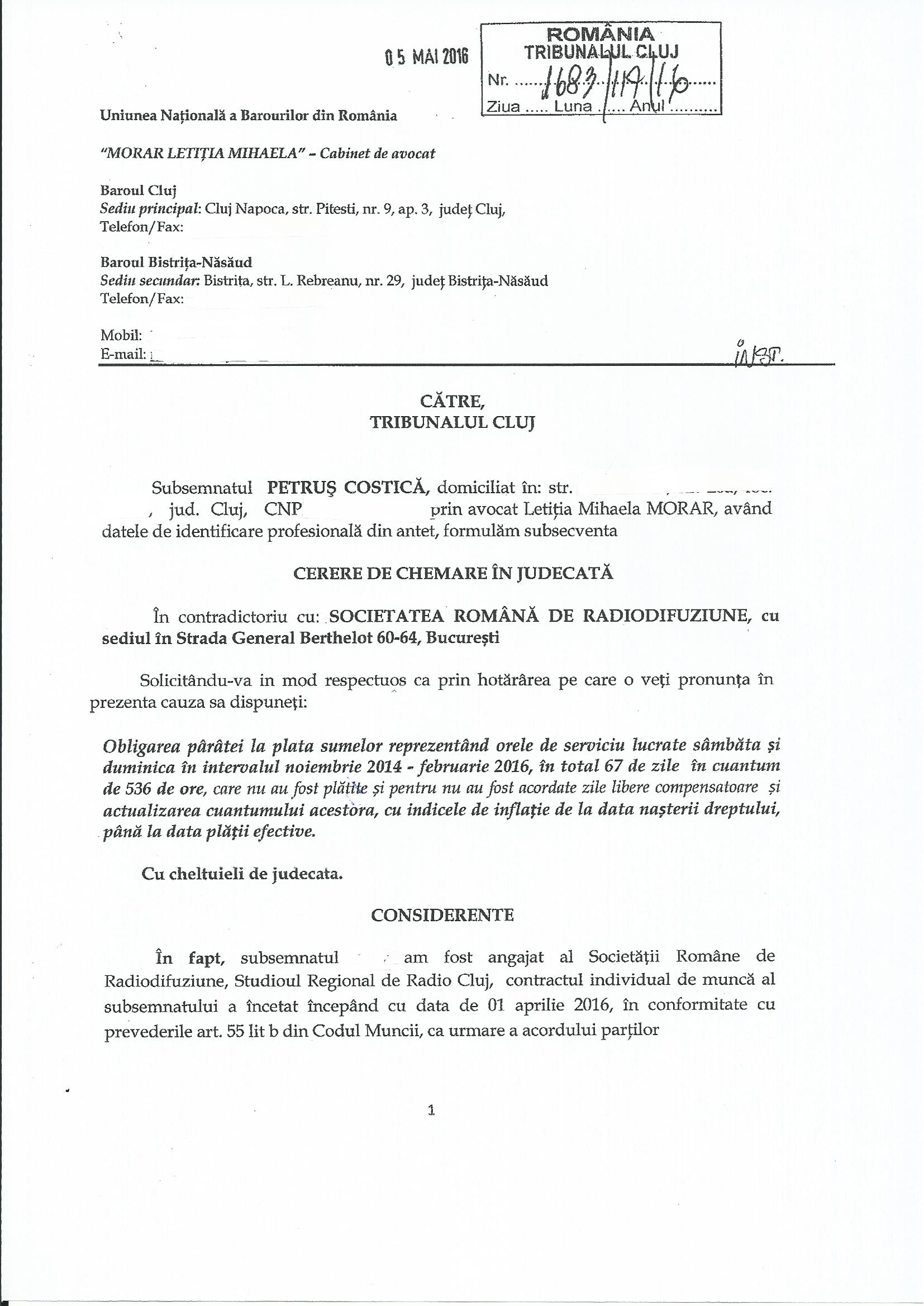 Vă prezentăm cererea de chemare în judecată a lui Costică Petruș: