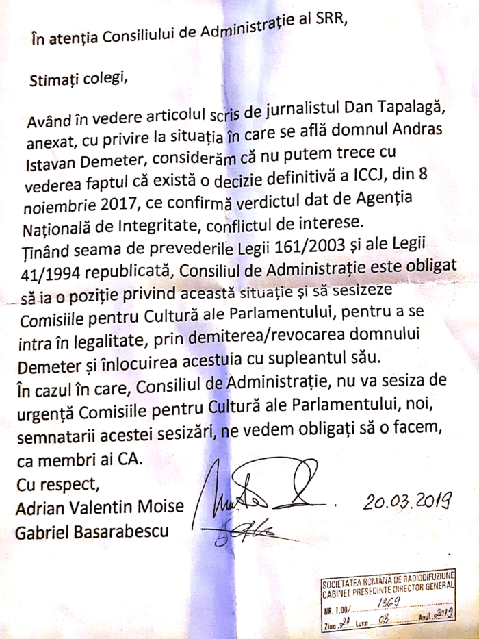 P.S. Și să nu uităm de un alt fost președinte-director general al SRR, Andras Istvan DEMETER, care a fost declarat definitiv de Înalta Curte de Casație și Justiție, în stare de conflict de interese (vezi aici), din data de 8 noiembrie 2017.