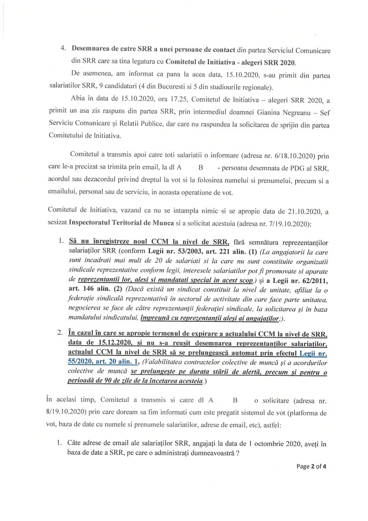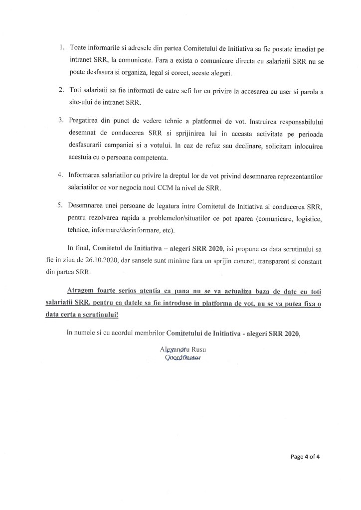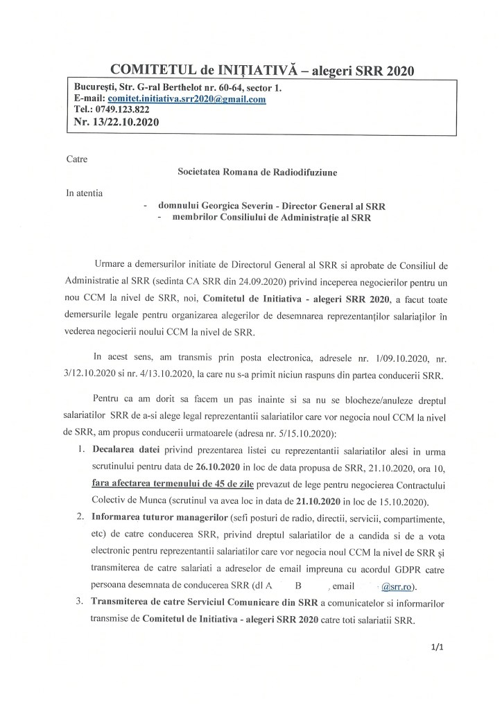 Aceasta este adresa transmisă de Comitetul de Inițiativă – alegeri SRR 2020 către Președintele-Director General și Consiliul de Administrație al SRR pentru a fi discutată și analizată în ședința CA al SRR de astăzi, 22.10.2020, ora 13.