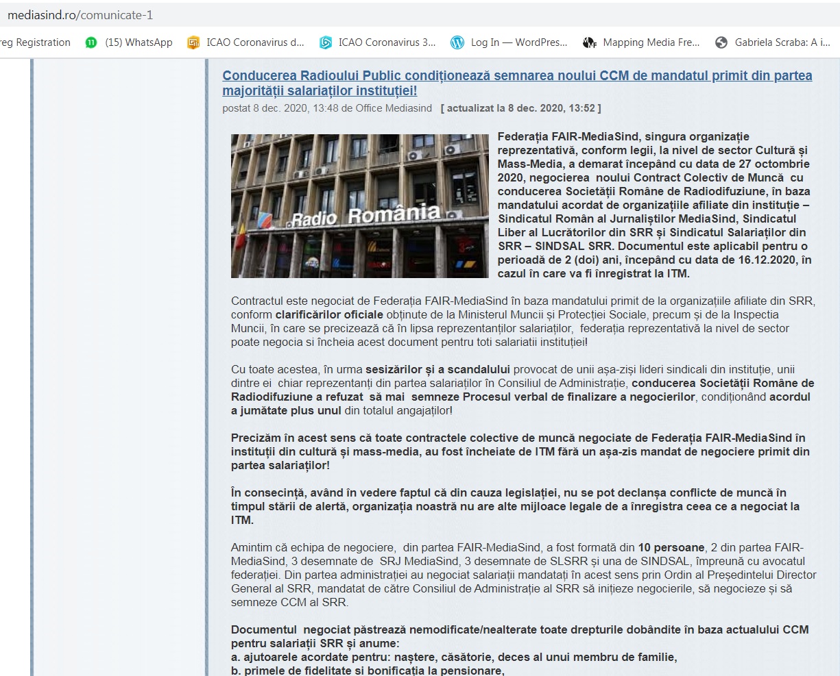”Conducerea Radioului Public condiționează semnarea noului CCM de mandatul primit din partea majorității salariaților instituției! ” (publicat în 8 decembrie 2020) și