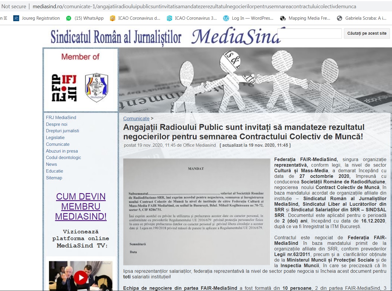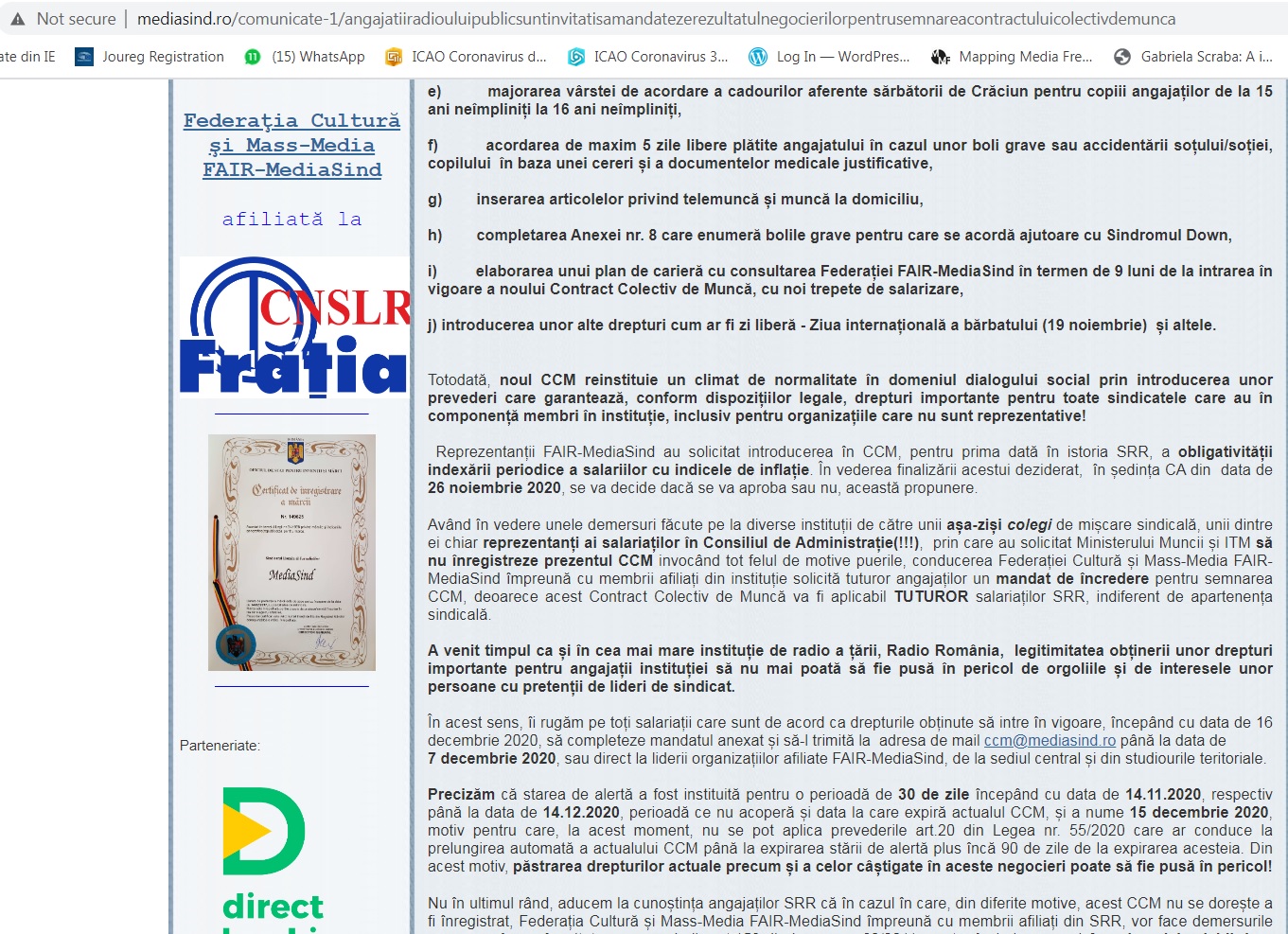 ”FAIR-MediaSind prezintă public documentul negociat în Societatea Română de Radiodifuziune ” (publicat pe 9 decembrie 2020).