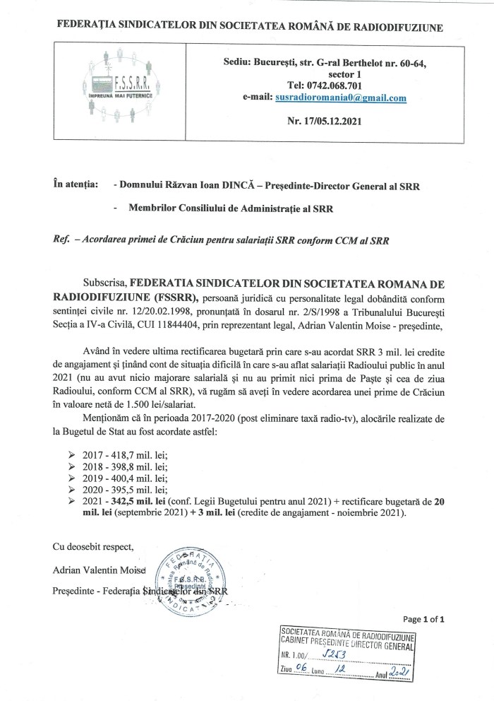 Sperăm că PDG împreună cu toți membrii CA al SRR vor sprijini această cerere pertinentă și vor putea să aducă un strop de fericire tuturor salariaților Radioului public, acum, la final de an.
