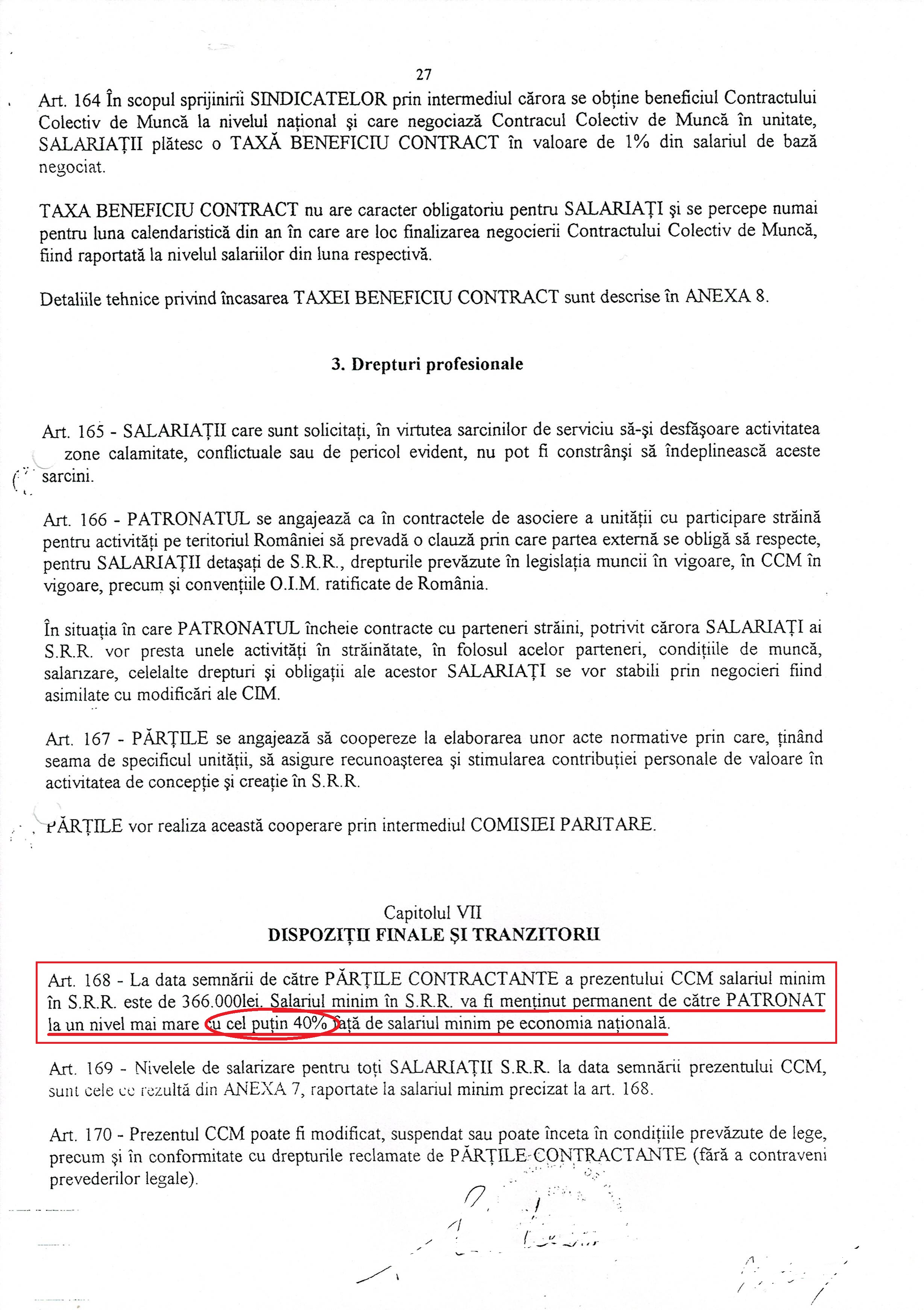Atunci s-a negociat și s-a hotărât ca salariul minim în Radioteleviziunea Română să fie cu 40% mai mare față de salariul minim stabilit la nivel național în România.
